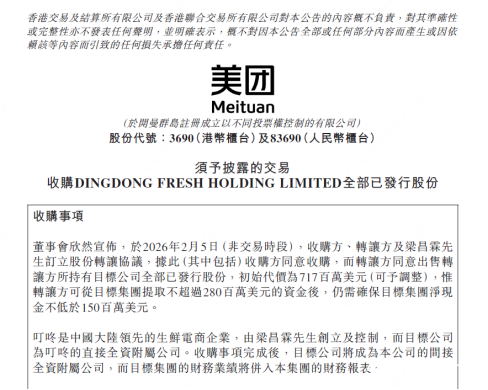 (图源:叮咚买菜官网)2月5日,美团于香港联交所发布公告,宣布以约7.17亿美元的初始对价,完成对叮咚买菜中国业务100%股权的收购。根据公告,叮咚买菜海外业务不在本次交易范围内,将在交割前完成剥离。