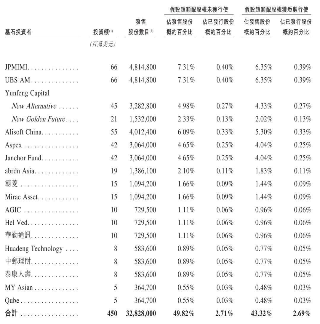 阿里旗下Alisoft China认购5500万美元,Li Ho Kei通过Aspex、Janchor Fund分别认购4200万美元,abrdn Asia认购1900万美元,霸菱、Mirae Asset分别认购1500万美元,AGIC、柴允敏旗下Hel Ved、华勤通讯分别认购1000万美元,开云appHuadeng Technology、中邮理财、泰康人寿分别认购800万美元,MY Asian、Qube分别认购500万美元。