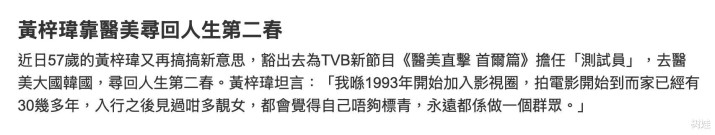 黄梓玮干与了TVB的新节目《医好意思直击 首尔篇》,在节目中她以测试员的身份去韩国作念医好意思,宣称要找回我方的第二春。TVB的艺东谈主那么多,缘何会礼聘黄梓玮?自然如今作念医好意思不是什么大新闻,然则关于好多名东谈主、明星来说,长久照旧思要呈现最自然的一面,少量数会自曝我方作念过医好意思,就更不要说上这种作念医好意思的节目。另外,黄梓玮在剧谈判多出演师奶,实践中亦然师奶,就她目下的神情、景况而言,简直便是师奶,连她也承认形象一般。是以她才要干与这个节目,但愿能通过相等形式回到10年前的黄金期,让我方站出来也充满自信,让东谈主认为我方真实一个艺东谈主,而不是一个师奶。