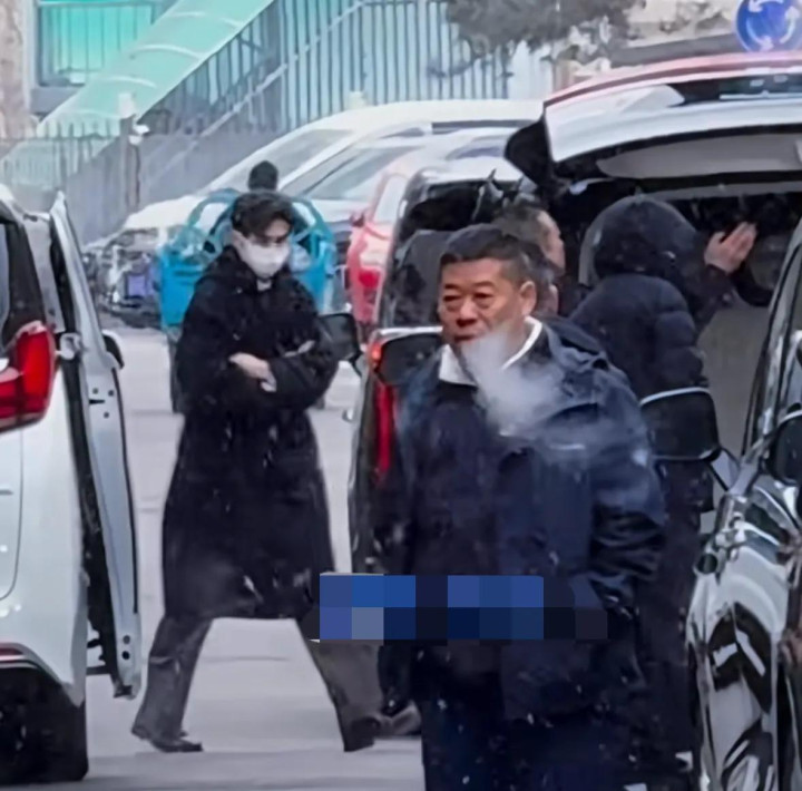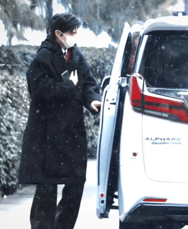 北京下起了雪,宋威龙从车上下来,他穿了一件黑色的长款大衣,下半身搭配了黑色西裤和薄底皮鞋,里面穿了一件白色的衬衫,他戴着白色口罩,因为天气冷把大衣拢的严严实实的。